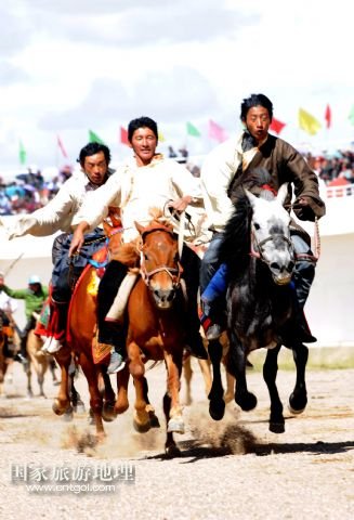 國(guó)家旅游地理 西藏那曲8月10日訊 8月10日,藏族牧民在進(jìn)行跑馬比賽。當(dāng)日,一年一度的藏北“恰青”賽馬藝術(shù)旅游節(jié)開(kāi)幕,牧民們相聚那曲賽馬場(chǎng),載歌載舞慶祝豐收。 /新華社記者唐召明攝