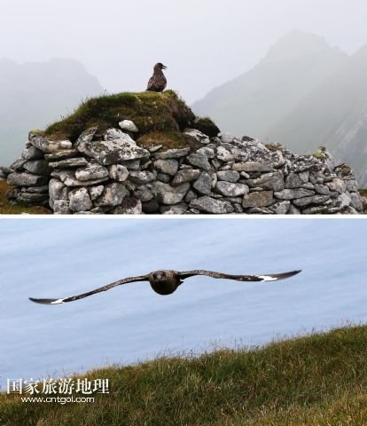 登上圣基爾達(dá)島并非易事,記者因風(fēng)高浪大在外赫布里底群島等待多日才有船出海。僅可乘載10余人的小船在風(fēng)浪中穿行了近3個小時,圣基爾達(dá)島終于出現(xiàn)在霧色籠罩的海面上。島上散落著十余座已經(jīng)荒蕪破敗的石舍和幾百個儲物石室,這些殘存的遺跡早已成為野羊與海鳥的巢穴,人類反而成為外來的訪客。人類文明的消失為一些稀有的物種和瀕臨滅絕的鳥類提供了安全的棲息地。島上陡峭的山坡隨處可見野羊悠然漫步,而那些嶙峋的峭壁和海礁則棲息著數(shù)十萬只各類海鳥。世界上最大的塘鵝群——約6萬對塘鵝在這座海島及附近的海礁上繁衍生息。