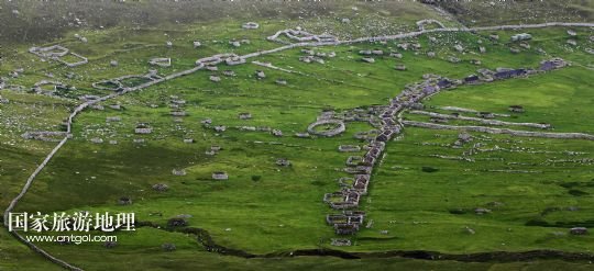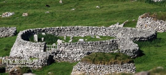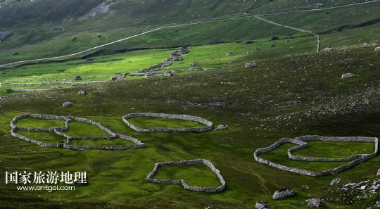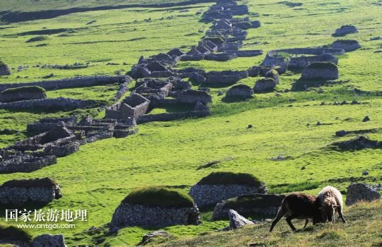 國家旅游地理 英國倫敦8月14日訊 在圣基爾達(dá)島已經(jīng)遺棄的村落旁的山坡上,有用石頭圍墻圈起的一塊塊耕地。當(dāng)年在島上定居的村民在這些石圈內(nèi)鋪墊海藻,種植少量谷物。一個個形狀各異的石圈保護(hù)著這些寶貴的谷物免遭風(fēng)暴與家畜的侵害(7月19日攝)。