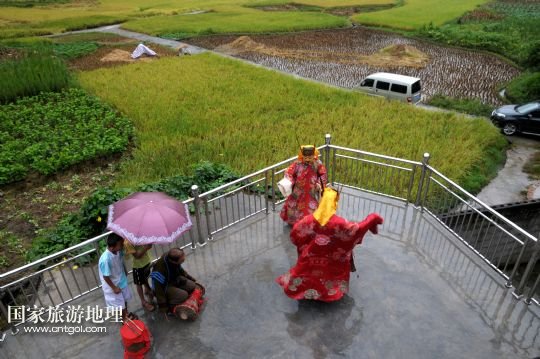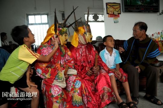 國家旅游地理 廣西河池8月19日訊 8月18日,譚圣慈老人(左一)帶著前來學(xué)習(xí)的兩名男孩跳儺面舞。在廣西北部與貴州交界一帶的我國唯一的毛南族自治縣——環(huán)江毛南族自治縣,神秘的儺戲被譽為毛南族的“族寶”。原始古樸、風(fēng)格獨特的儺戲是毛南族的民間傳統(tǒng)舞蹈,藝人在表演過程中經(jīng)常戴著被稱為儺面的木制面具。儺面一般高30厘米、寬20厘米,由毛南族藝人在民族口頭文學(xué)的基礎(chǔ)上依據(jù)個人想象創(chuàng)作,用優(yōu)質(zhì)木塊雕琢而成,共有文、武、善、兇四大類72種面相。