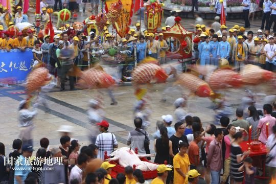 國(guó)家旅游地理 浙江寧波9月14日訊 9月14日,在浙江省寧波市象山縣,當(dāng)?shù)貪O民在進(jìn)行漁區(qū)民俗文化表演。當(dāng)日,浙江寧波象山縣舉行漁區(qū)民俗文化巡展,魚燈、馬燈、百獸燈、船燈等13支表演隊(duì)為游客奉獻(xiàn)了精彩的民俗表演,展現(xiàn)了象山燦爛的民俗文化和獨(dú)特的海洋風(fēng)情。 /新華社發(fā)(張培堅(jiān) 攝)