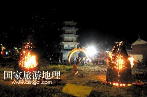 國家旅游地理 福建泉州9月20日訊(記者_黃偉強 秦越 文圖) 中秋夜,第三屆“燒塔仔”中秋民俗活動在晉江安海安平橋畔白塔下舉行,兩座高4米、寬1.5米的磚塔里正冒著熊熊烈火,現(xiàn)場火光沖天,給安海老百姓帶來了別樣的節(jié)日歡樂。