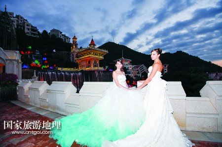 乘著電瓶車,從客天下廣場穿過雅致的圣山湖住宅區(qū),赫然出現(xiàn)在眼前的卻是大型婚禮殿堂,純歐式的建筑群隱匿在青山綠水中:乳白色的圓形屋頂、七彩斑斕的玻璃窗、富麗堂皇的大吊燈,見證了一對又一對新人走進幸福的殿堂。在充滿異域風情的幸福里大街,蘇格蘭風笛表演、皇家馬車、中世紀格調(diào)的咖啡館,一幕又一幕,讓人恍若時空交錯。
