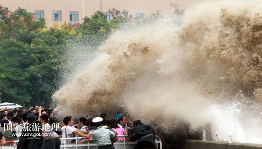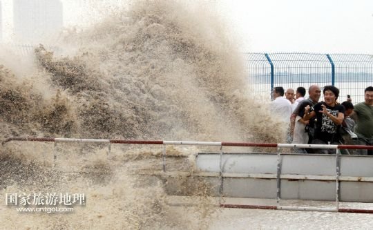 浙江杭州:錢江潮水引游客(圖)