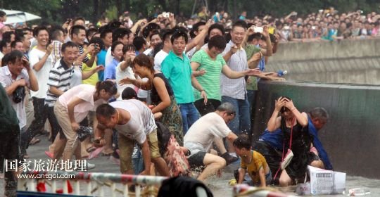9月21日,在杭州下沙錢塘江沿岸,不少躲避不及的觀潮者被來勢洶洶的潮水淋得全身濕透。