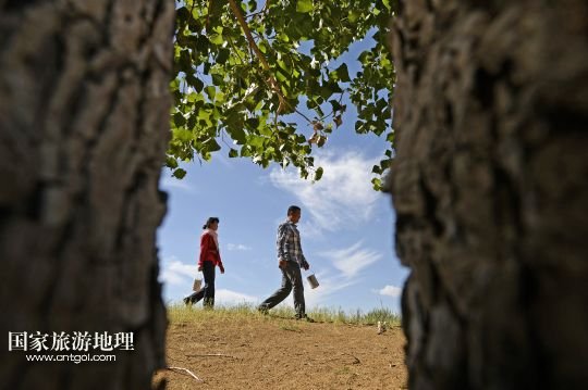 顧蕓香與丈夫在治沙現(xiàn)場(chǎng)查看已經(jīng)成材的大樹(7月23日攝)。