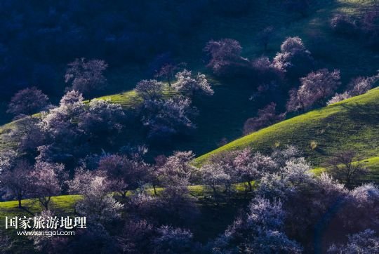 在新源縣吐爾根鄉(xiāng)原始杏花林里的山坡上,杏花競相綻放(4月9日攝)。