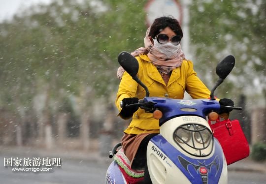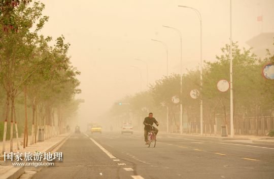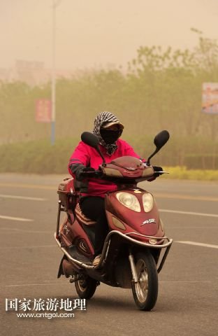 國(guó)家旅游地理 寧夏中衛(wèi)4月24日訊 4月24日,在寧夏回族自治區(qū)中衛(wèi)市,一位市民在沙塵天氣中騎行。當(dāng)日,寧夏回族自治區(qū)中北部地區(qū)遭遇強(qiáng)沙塵天氣,寧夏氣象臺(tái)于當(dāng)日7時(shí)40分發(fā)布沙塵暴黃色預(yù)警信號(hào):預(yù)計(jì)未來(lái)12小時(shí)內(nèi)全區(qū)大部有5-6級(jí)偏北風(fēng),陣風(fēng)7-8級(jí),伴有揚(yáng)沙或浮塵天氣,銀川、石嘴山、吳忠、中衛(wèi)四市的部分地區(qū)可能出現(xiàn)能見(jiàn)度小于1000米的沙塵暴天氣。 /新華社記者 彭昭之 攝