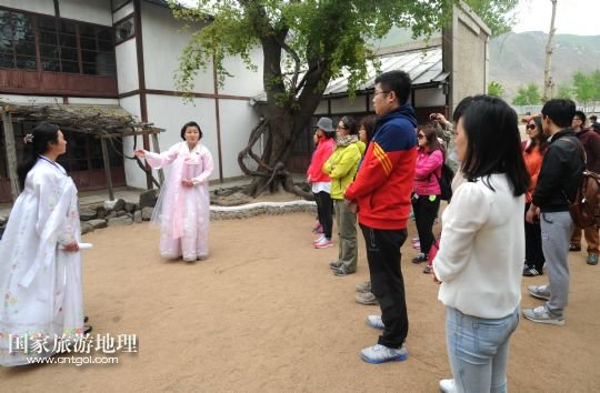 中國(guó)游客在參觀朝鮮南陽(yáng)國(guó)際旅館(5月2日攝)。
