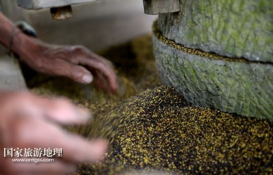 國家旅游地理 湖北恩施6月23日訊 6月21日,在湖北省宣恩縣箭竹坪村的榨油房里,“打榨佬”們揮舞撞錘猛擊楔子。紀錄片《舌尖上的中國》第二季熱播,讓片子中出現(xiàn)的手工榨油技藝進入公眾的視野。在湖北西部山區(qū)恩施土家族苗族自治州宣恩縣李家河鄉(xiāng)箭竹坪村,依然留存有手工榨油的榨房及一批身懷絕技的手藝人。