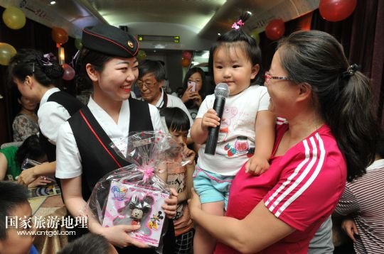 國家旅游地理 寧夏銀川6月1日訊 5月31日晚上,蘭州鐵路局銀川客運(yùn)段寧夏號列車上的一線乘務(wù)人員為乘坐列車的孩子們舉辦了一場“歡慶六一”迷你晚會,通過才藝展示和贈送小禮品,讓旅途中的孩子們感受到溫暖和歡樂。新華社記者 彭昭之 攝