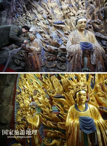 修復(fù)前后的重慶大足千手觀音造像全景(拼版照片,上圖上:2011年10月27日攝,上圖下:2015年4月4日攝)。