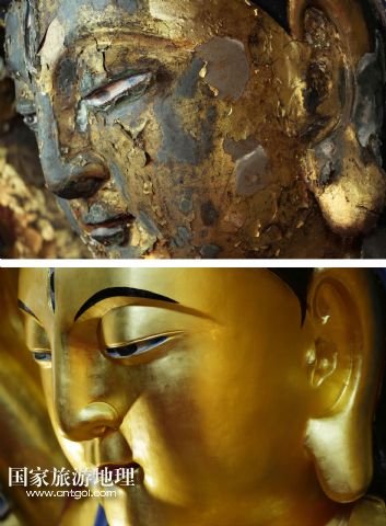 修復(fù)前后的重慶大足千手觀音造像主尊特寫(xiě)(拼版照片,上圖上:2011年2月24日攝,上圖下:2015年3月31日攝)。